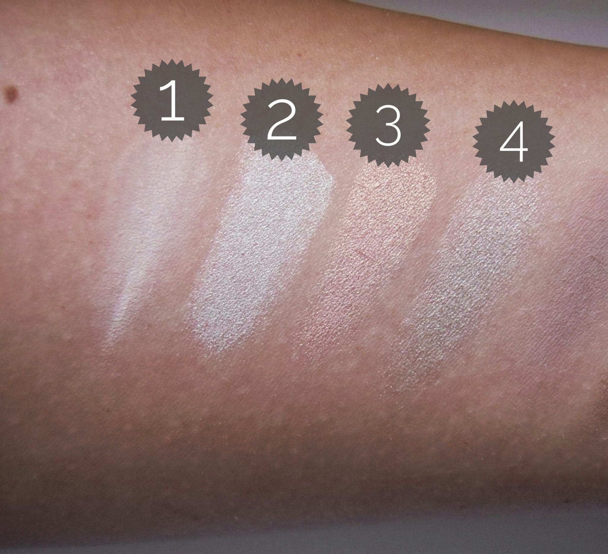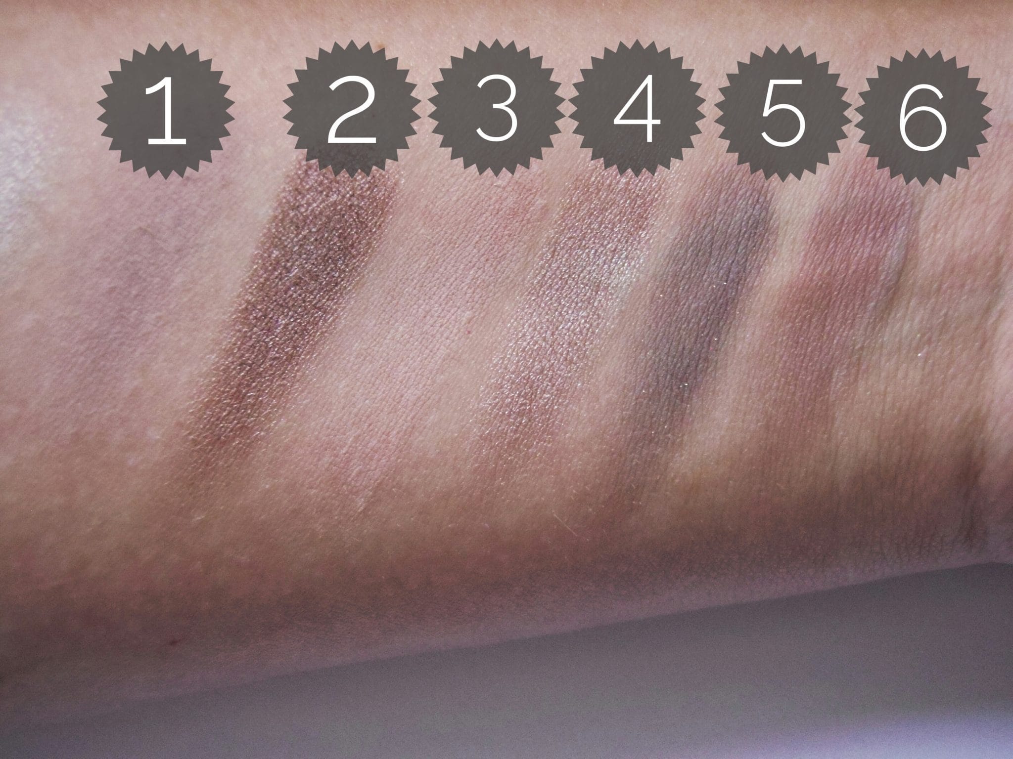 I took swatches with my fingers without a primer on the skin. I wanted to use a MAC 239 for this, but with a brush, they just didn’t stick to the skin. The camera couldn’t pick it up at all.